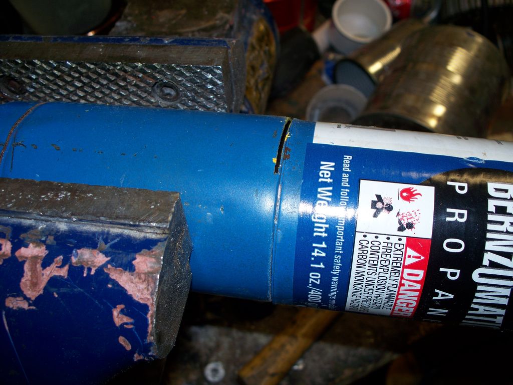 Окуните металл в воду и нагрейте концы по одному. Согните их, чтобы они смотрели друг на друга. Окуните концы в воду и повторно нагрейте центральный изгиб. Отклоните его и разверните так, чтобы концы, которые вы согнули, входили в отверстия в пропановом баке.