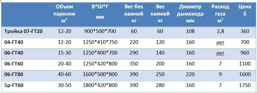 Технические характеристики печей Тройка с газовой горелкой (чтобы увеличить размер таблицы щелкните по картинке правой клавишей мыши)