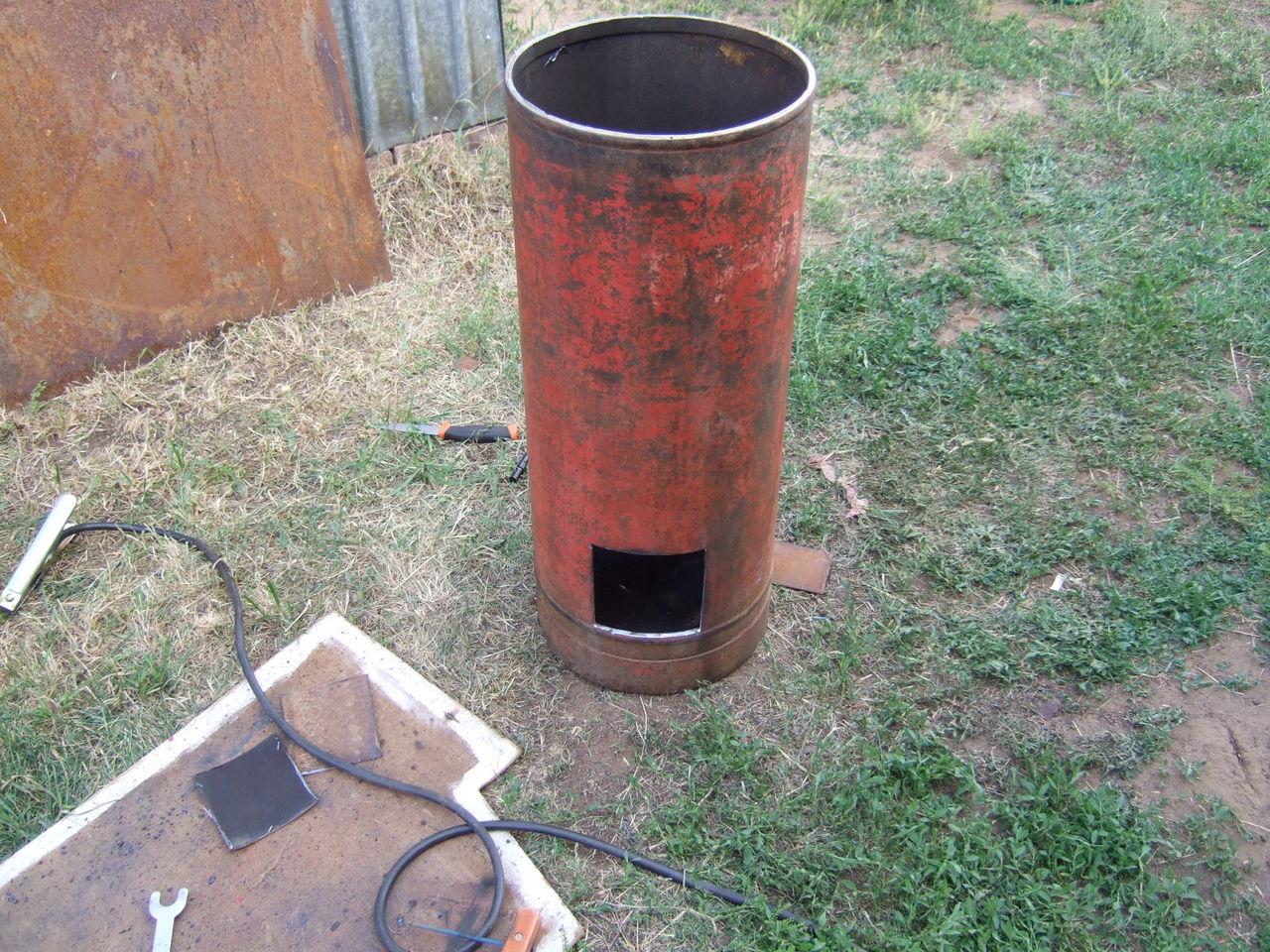 - Проводятся сварочные работы. Выполняется монтаж баллона с ножками, сбор поршня, приваривание дымоотводной трубы, крышки после сбора печи, петель для дверцы загрузочной камеры.