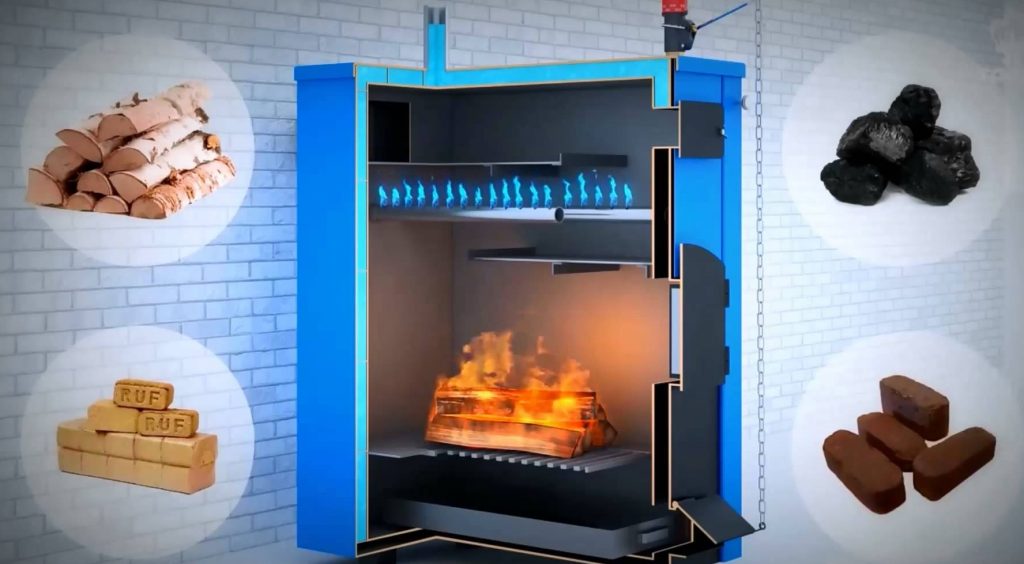 - вариативностью размещения теплообменников (камеры сгорания и тления располагаются в разном порядке). Если топка находится сверху, а камера дожига газов — снизу, тогда необходима принудительная тяга с помощью дымососов и вентиляторов. Если же, наоборот, топка расположена снизу, то срабатывает естественная тяга.