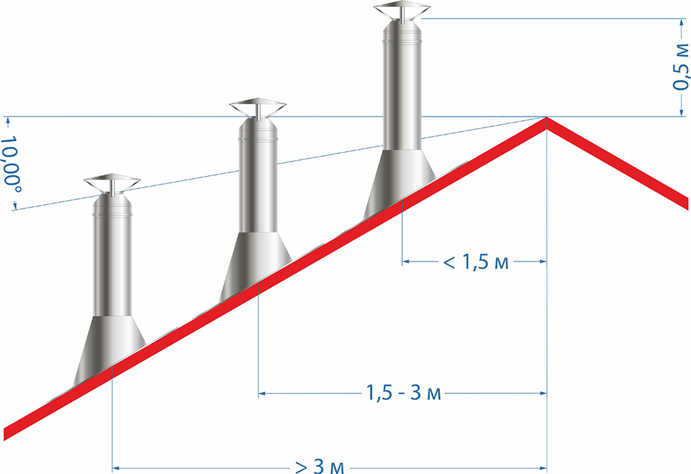 Если кровля имеет плоскую конструкцию, то высота над кровлей составляет минимум 50 см. На скатных кровлях, в случае расположения дымохода на расстоянии от конька до 1,5 м, высота ее должна быть не меньше 50 см относительно последнего или ограждающего парапета. Если он расположен в пределах 1,5–3 метров — высота не может быть ниже конька или парапета. Когда конструкция находится дальше 3 метров от линии конька, то его минимальная высота определяется путем проведения линии под углом 10 градусов относительно горизонта.