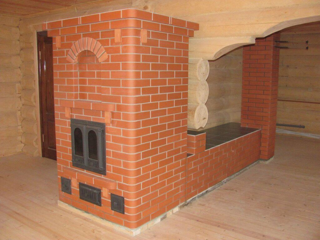 Чем выше марка кирпича, тем он плотнее, а значит, лучше выглядит лицевая сторона. Внутреннюю поверхность топочной камеры выкладывают шамотным кирпичом. Это значительно увеличивает срок службы изделия. Облицовку печей и каминов делают полнотелым кирпичом высокой марки. Форма облицовочного кирпича может быть прямоугольной или фигурной. Из фигурного выкладывают углы печки и декоративные элементы.