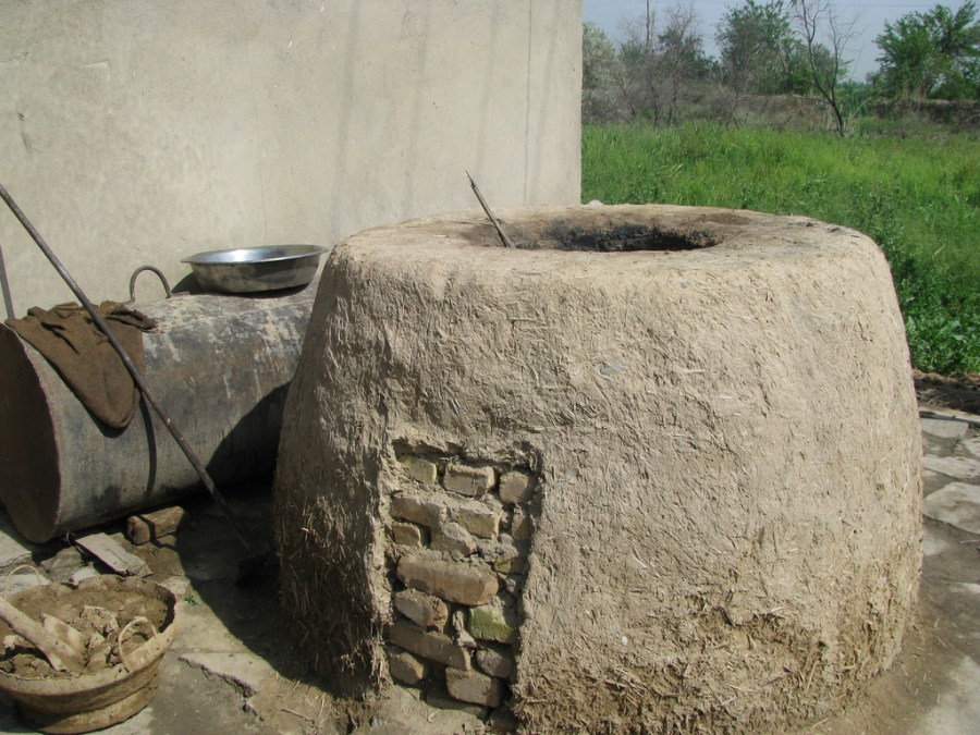 Узбекская модель печи может существенно различаться в зависимости от достатка хозяина, региона, в котором она используется. Основной материал для изготовления конструкции — глина. Внутри располагаются специальная арматура (вставки из каолина или огнеупорного кирпича).