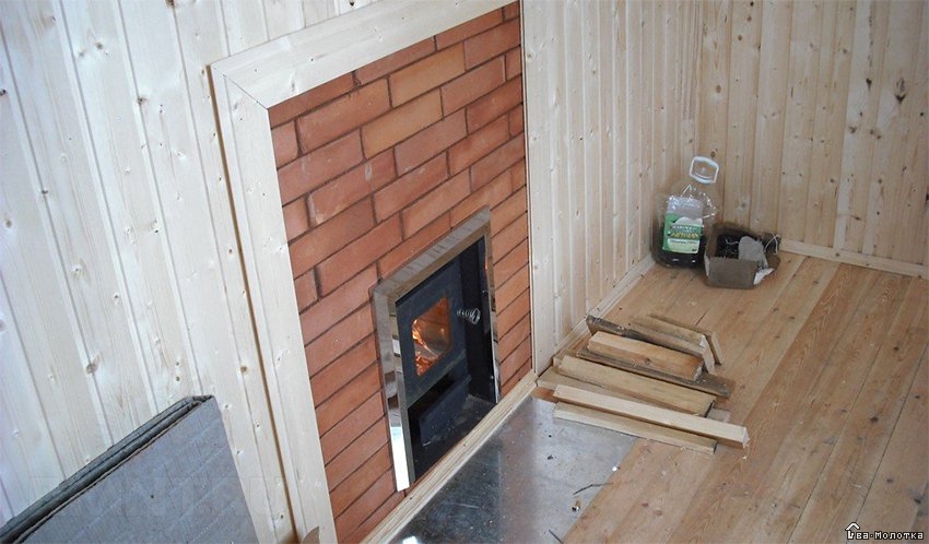 - Для безопасного использования и минимального отступа от стены можно добиться, просто сделав защитные экраны из шамотного кирпича. Такая конструкция позволит установить печь практически вплотную к стене и способствует накоплению экранами тепла и постепенной отдачи его в помещение после сгорания дров.
